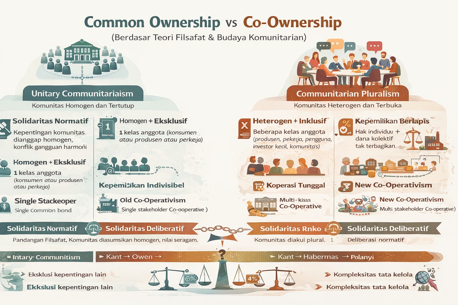 Secara teoritis, co-ownership berakar pada communitarian pluralism. Aliran ini tetap menolak atomisme liberal, namun juga menolak romantisasi komunitas yang tunggal dan harmonis. Solidaritas tidak dianggap sebagai kondisi awal, melainkan sebagai hasil dari proses deliberatif. Konflik bukan tanda kegagalan organisasi, tetapi konsekuensi logis dari pluralitas sosial yang justru memperkaya tata kelola.